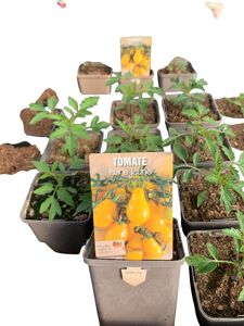 La tomate Poire jaune est une variété ancienne de type Cerise aux petits fruits jaune orangé en forme de poire, ferme, sucrée avec un bon équilibre d’acidité. Très gratifiante, et de bon rendement, c’est une variété de croissance indéterminée qui peut atteindre 2 m de haut !