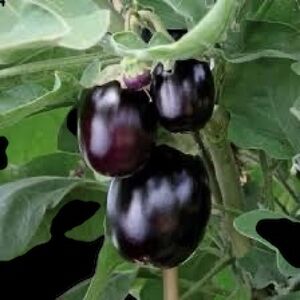 Variété précoce et productive. Variété à port compact, idéale pour un potager sur balcon ou terrasse. Petits fruits pourpre-noir de la taille d’un uf (80g environ).