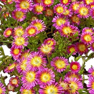 Ce nouveau delosperma produit de grandes fleurs, d'un rose chaud et vif, autour d'un bel oeil presque rouge et d'un coeur jaune. Cette petite vivace couvre-sol à feuilles succulentes qui fleurit de juin jusqu'à octobre est un excellent choix pour les sols secs et les expositions ensoleillées. On l'utilisera pour couvrir les murets, combler les rocailles, ou pour l'ornement des terrasses et suspensions. Semi-rustique, elle résiste jusqu'à -8°C en sol sec.