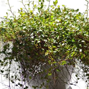 Le Muehlenbeckia complexa est une jolie plante néo-zélandaise volubile, aussi bien grimpante que rampante, souvent utilisée dans les vasques et suspensions d'où elle retombe en rideaux légers. Ses tiges fines se hissent sur tout support mis à leur disposition ou bien s'enracinent au contact du sol, formant un épais tapis enchevêtré. Leur couleur sombre contraste agréablement avec les petites feuilles rondes d'un joli vert vif, qui persistent plus ou moins en hiver. Facile à cultiver dans nos régions pas trop froides, résistant à la sécheresse et au vent, extrêmement plastique et polyvalent, cet arbuste insolite est précieux pour orner le pied des arbres ou des arbustes, festonner une rocaille ensoleillée ou un mur végétalisé, stabiliser un talus ingrat, habiller un grillage...
